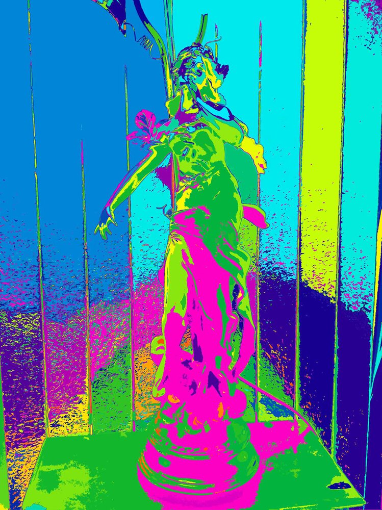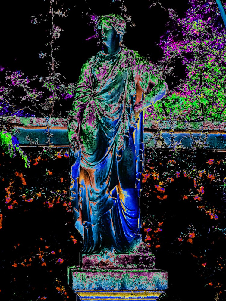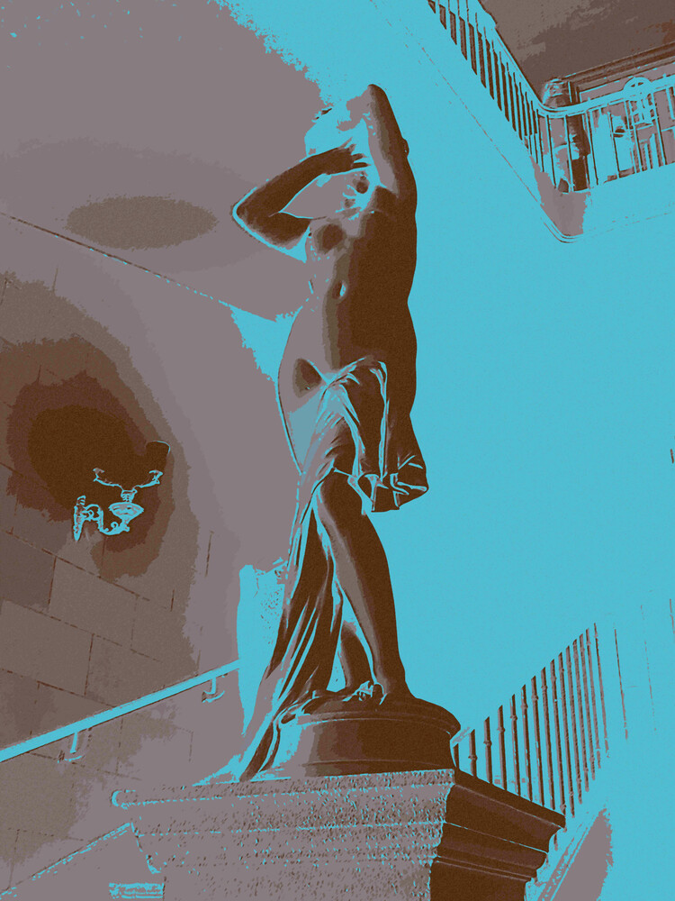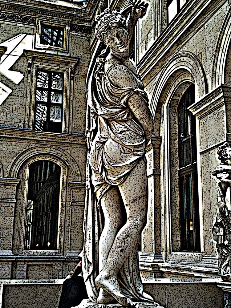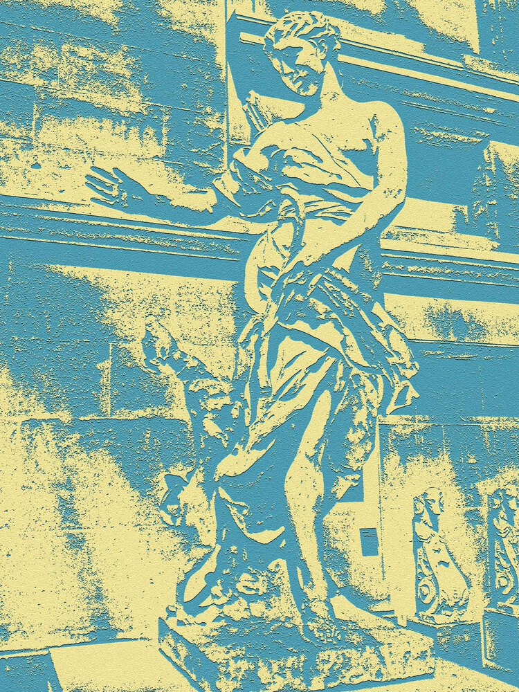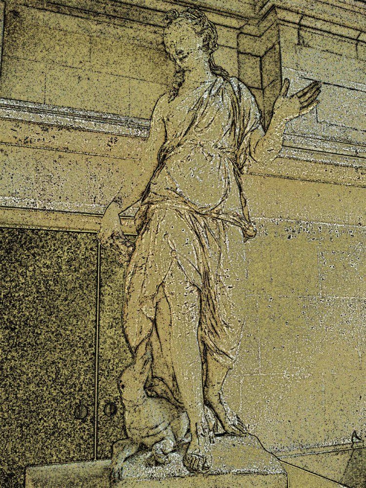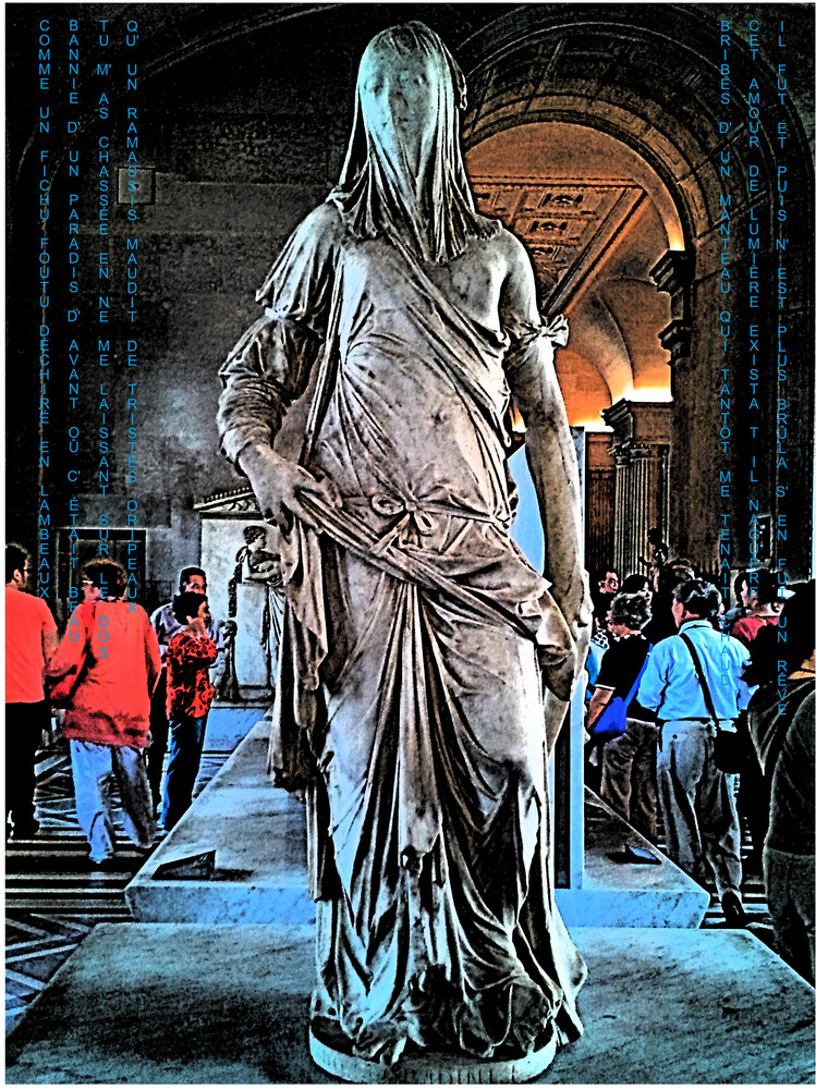 Je les regarde avec mon oeil actuel et aime à les emmener dans des univers où elles se révèlent à une vie nouvelle. Le brouillage des repères spatio-temporels ou des repères de la représentation ( fusion des plans, confusion des matières...) est une zone d'exploration plastique que j'aime fouiller, cherchant à mettre au jour, au-delà du plaisir de la découverte, le potentiel esthétique, l'unicité expressive et signifiante de chaque statue. Ainsi, j'ai le sentiment de poursuivre le même chemin que le sculpteur initial, l'outil numérique moderne me servant de burin pour dégager et révéler dans la gangue inerte et commune, la présence de la pépite singulière.